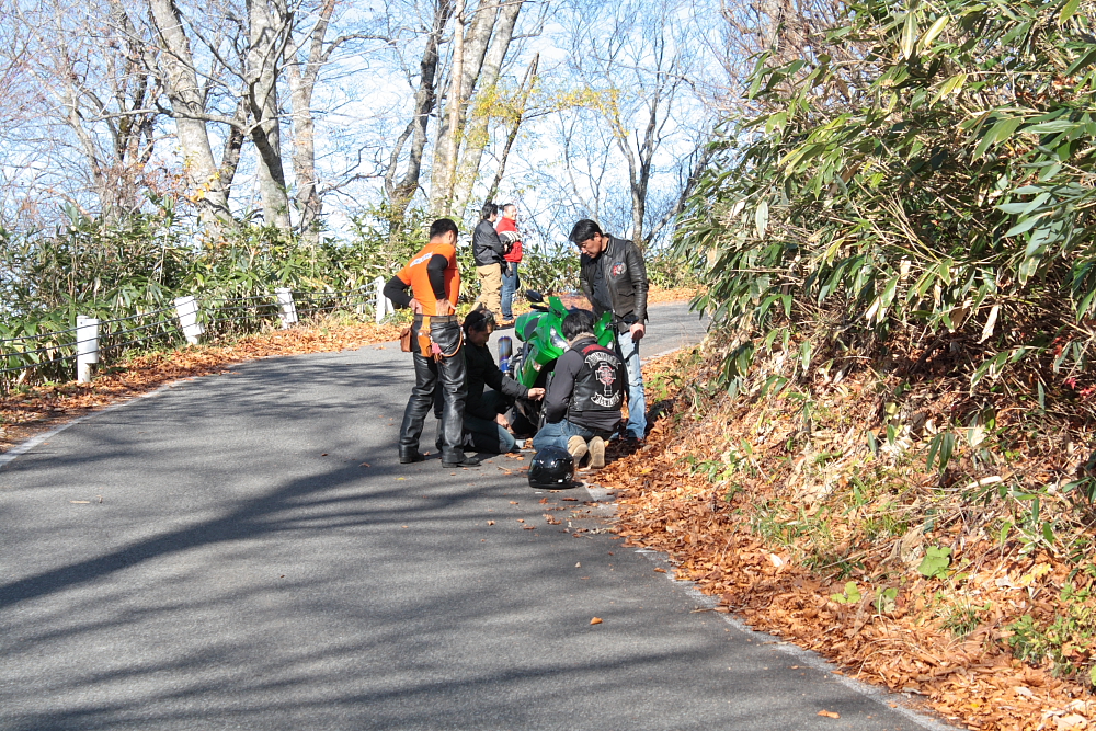 道中、不運にも狭いカーブで車と接触、転倒してしまい、1台は走行不能に・・